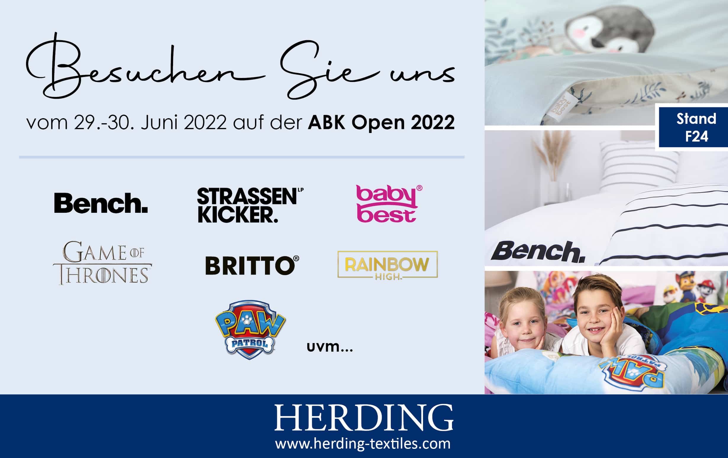 From 29-30.06.2022 we will be exhibitors at the trade fair for household textiles, bedding and sleep systems “ABK OPEN” in Bad Salzuflen. On 12,000 square meters of exhibition space, more than 130 companies will present their current brands and collections there. Besides our Heimtextil bestsellers like Paw Patrol, Britto or Bench, our HERDING team will personally present an absolute novelty there. Our customers can be curious.